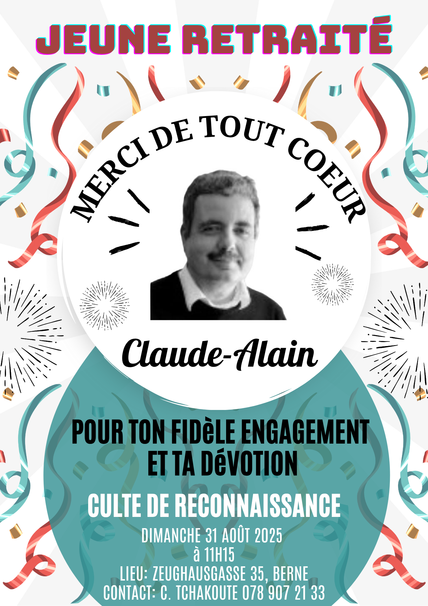 ♦ Dimanche 31 Août, à 11h15: Culte spécial départ à la retraite de Claude-Alain